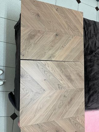 Cabezal para cama de matrimonio de 150 cm con un diseño que imita la madera. - Acabado en tonos beige y marrón. - Diseño con lamas en espiga. Se compró en Maisons du mundo hace 2 años y está por estrenar. Tal y como se puede ver en las fotos, se pega a la pared, las láminas son delgadas.