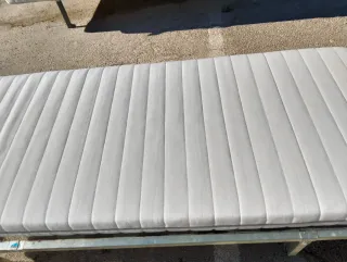 Se vende cama individual de Ikea con colchón a estrenar. - Medidas: 90x200 cm. - Estructura de tela y madera. - Colchón sin usar.