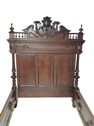 Cama de columnas Isabelina, mediados del S. XIX. Realizada en madera de pino macizo. Un ejemplar de gran pureza formal que destaca por la elegancia de sus postes torneados. Es para colchón de 105 x 190 cm. Restaurada hace unos años, está en buen estado, lista para usar. Muy muy sólida. Fácilmente desmontable para transporte y almacenaje. - Diseño de madera tallada. - Cabecero ornamentado con detalles. - Estructura robusta. Cama antigua antigüedades fernandino antique deco decoracion