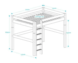 Cama alta de madera con medidas detalladas en la imagen. Ideal para optimizar el espacio. - Medidas exteriores: 211cm (largo) x 131cm (ancho). - Altura total: 169cm. - Espacio libre bajo la cama: 134cm. - Medidas del colchón: 120x200 cm. - Requiere recogida local.
