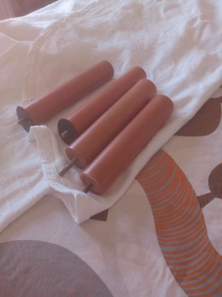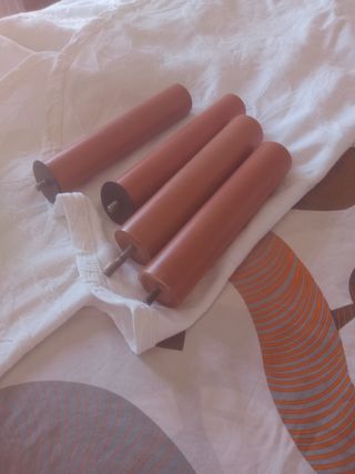 Tres patas de cama de madera maciza. Son de color marrón y parecen estar en buen estado. - Ideales para restaurar muebles. - Se venden juntas. - Miden aproximadamente 20cm de largo.