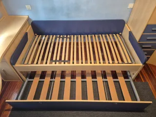 Vendo cama nido con patas y colchones incluidos todo en perfecto estado. - Para colchones de 190x90cm - Estructura principal de madera. - Segunda cama extraíble y elevable con patas. - Detalles en madera azul. - Ambos colchones incluidos, (también se pueden comprar individualmente). - Recogida a cargo del comprador, será entregada desmontada. - Precio Negociable