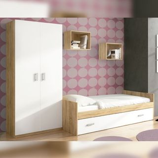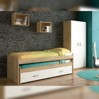 Dormitorio juvenil compuesto por un armario de 2 puertas y un conjunto de cama nido con dos estanterías cubo, perfecto para el ambiente que buscas para tu hijo o hija. Sus colores crean una combinación única y maravillosa, pensada para el descanso del pequeño. Incluye el somier de arrastre de 3 pletinas para la cama nido. ENVIO:Se entrega en puerta de casa gratis en gijon sin montaje,con montaje tiene un costo adicional.Aviso importante: Las descripciones, imágenes, medidas y precios de los productos pueden contener errores tipográficos o variaciones. Antes de realizar tu compra, te recomendamos confirmar toda la información.