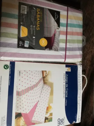 Juego de cama de 3 piezas con un diseño alegre y colorido. Incluye bajera Ajustable. Las vendo a 10 euros cada una, están por estrenar. - Medidas: sábana encimera 160x270 cm, sábana bajera 190/200x90 cm, funda de almohada 45x110 cm. - Composición: 50% Algodón, 50% Poliéster. - Densidad: 57 hilos/cm².