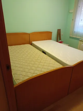 Se venden dos camas individuales con cabecero y mesilla integrada a juego. El cabecero y la mesilla son de madera y las camas tienen somier Flex de muelles con cubierta de piel sintética y colchón en buen estado. - Cabecero colgante de madera (largo 225 × alto 71 × ancho 17). Con una mesilla de dos cajones entre las dos camas (largo 35 × ancho 24). - 2 Somieres de muelles con 2 ruedas cada uno 180×90. - 2 Colchones 180×90.