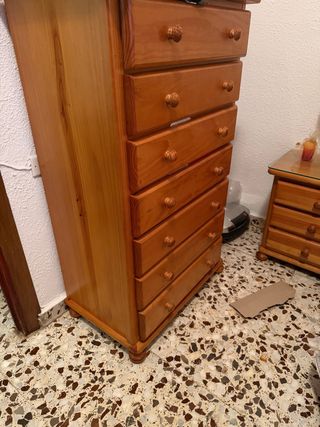 Cómoda de madera con seis cajones, ideal para organizar tu ropa. - Fabricada en madera de pino. - Tiradores redondos de madera. - Acabado natural brillante. Mesilla Cama con cabecero, colchón somier de 90