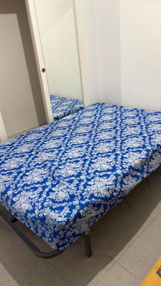 Se vende cama doble de matrimonio de 1,35 metros. - Estructura metálica. - colchón con Funda de tela con estampado floral azul y blanco.