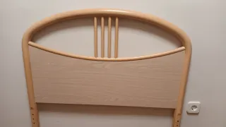Se venden dos cabezales de cama de madera, ideales para camas de 90 cm. Se encuentran en buen estado. - Diseño curvo superior. - Detalles de varillas verticales. - Acabado en tonos beige y marrón.