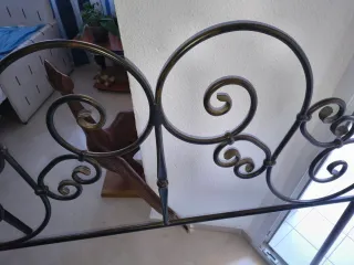 Elegante cabecero de forja con detalles en dorado, perfecto para camas de 135cm, valorado en 180 euros. - Diseño con espirales y remates. - Acabado bicolor que aporta un toque clásico.