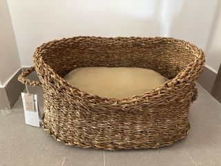 Cama para mascotas de seagrass trenzado con forma ovalada. SIN ESTRENAR, CON ETIQUETAS. Incluye cojín interior con relleno. medida cesta 23 x 47 x 33 cm medida cojín 50x35x12,5 cm