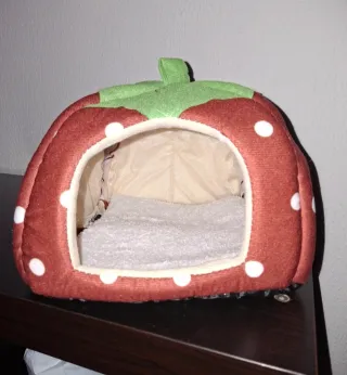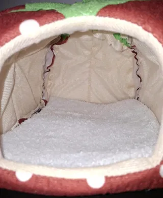 Adorable cama para mascotas con forma de fresa. Suave y acogedora para tu compañero.No se ha usado,está nueva - Diseño divertido de fresa con puntos blancos. - Interior forrado en tela beige. - Cojín interior de felpa gris.