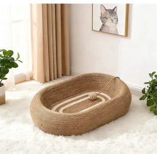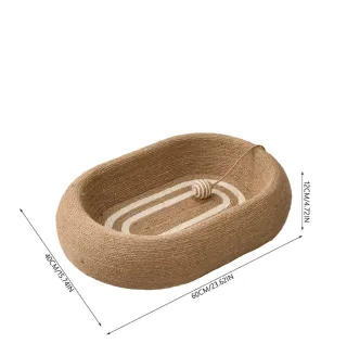 Cama ovalada para gatos, ideal para descansar y jugar. Fabricada con materiales resistentes y un diseño atractivo. - Material principal: yute trenzado. - Diseño interior con bandas de color claro. - Incluye una pelota de juguete colgante.