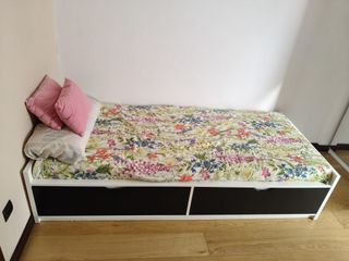 Cama individual en buen estado, con un diseño práctico y funcional. - Medidas 2,80 m largo x 0,98 m ancho - Incluye dos amplios cajones para almacenamiento. - Estructura de madera con acabado blanco y negro - Incluye el colchon