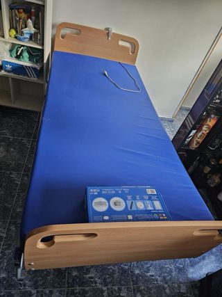 Cama articulada en buen estado, funciona perfectamente. - Estructura de madera. - Colchón azul incluido.