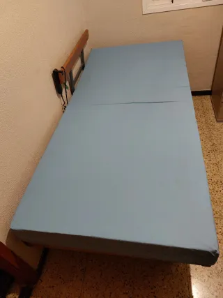 Cama articulada de 105cm con muy poco uso, solo tres meses. - Estructura de madera. - Colchón azul.
