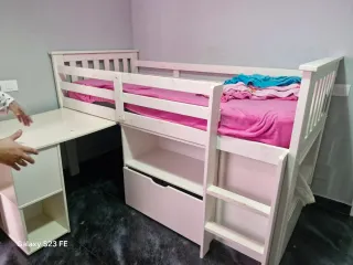 Cama infantil con un diseño moderno y funcional, perfecta para habitaciones de niños o jóvenes. Incluye prácticos cajones para almacenamiento. - Estructura de madera y plástico. - Tonos blancos y rosas. - Precio negociable
