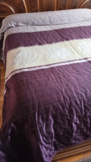 Edredón colcha cama grande, no pesa, morado,lila, gris mate y brillo. Moderno y clasico. Medidas muy amplias para cubrir mucho almohada. Queda la cama preciosa. Regalo 2 cojines