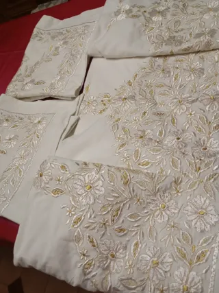 Precioso juego de cama de algodón blanco, bordado a mano con delicados motivos de ángeles. El conjunto incluye una encimera y dos fundas de almohada. Las puntadas son finas y elegantes, creando un diseño encantador. - Bordado artesanal de ángeles. - Diseño floral complementario. - Acabados impecables.Muy grande 240 de ancho almohadones 93 x57