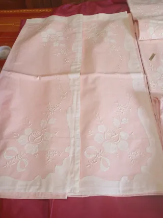 Precioso juego de cama con bordados florales. - Diseño floral blanco sobre fondo rosa. - Elaborado con algodón de alta calidad. - Acabado artesanal a mano. Mide 2,60 x .2,30