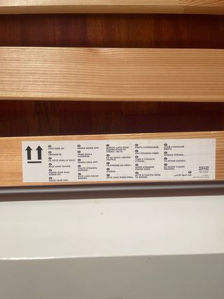 Cama individual de la serie Släkt de Ikea. Cuenta con un diseño moderno y funcional, ideal para habitaciones. - Estructura de madera. - Color blanco. La cama está desmontada.