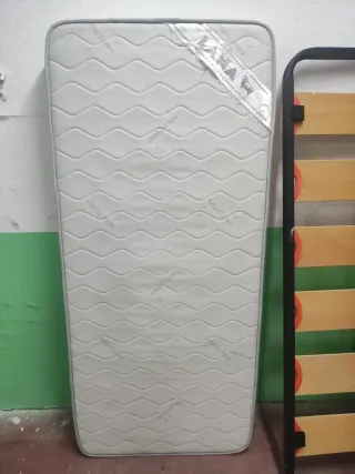 Cama individual de 2 metros de largo por 90 centímetros de ancho. - Estructura de madera.tiene su Uso con alguna zona levantada la pintura o pegote lavable - Somier de láminas de madera. + colchón a medida nuevo