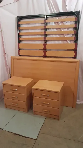 Conjunto de cama de matrimonio con cabecero y dos mesitas de noche a juego. Muebles de madera clara. - Cabecero de cama de madera. - Dos mesitas de noche con tres cajones cada una. - Medidas: 135x190cm.