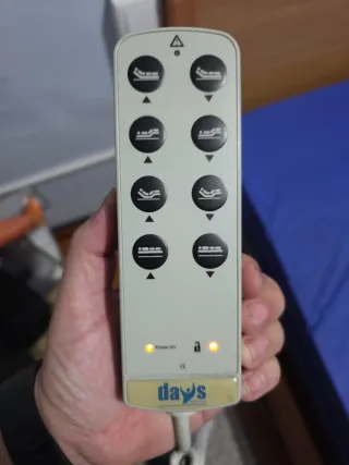 Cama de cuidados (ortopédica) electrónica con barandilla. - Ruedas con frenos - Barra de ayuda - Barandilla ambos lados - Ajustable con mando - Manual de instrucciones - Estructura de madera. - Colchón azul.