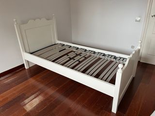 Cama individual en buen estado, con un diseño clásico y elegante. - Estructura de madera robusta. - Cabecero con detalles decorativos. - Somier de láminas incluido. Altura cabezal 104cm Para colchon de 90cm*190cm En buen estado, solo algunas marcas de uso en la parte interior de las patas (fotos) Solo recojida en persona