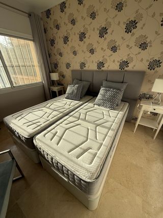 Se venden dos camas individuales de 105x190 cm. 70€ por separado, 120€ las 2 juntas. (Base tapizada, colchon con funda y almohada) incluyo 2 colchas nuevas - Estructura de madera. - Tapizado en tela.