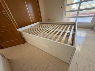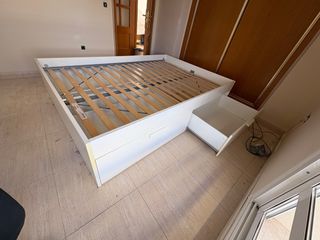 Cama de matrimonio modelo Brimnes de IKEA, con unas medidas de 140x200 cm. Incluye 4 amplios cajones de almacenaje integrados y somier de laminas - Estructura de madera.