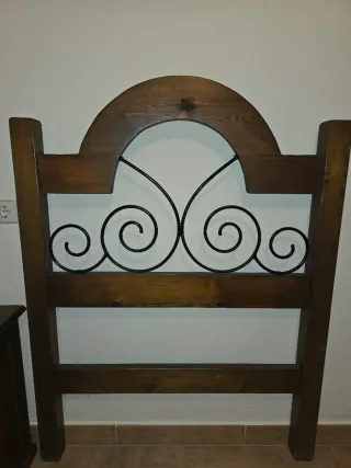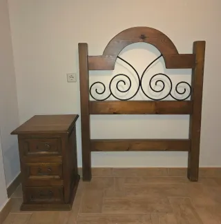 Conjunto de dos cabeceros de madera para cama de 90cm y una mesita de noche a juego. - Cabeceros con diseño rústico y detalles de forja, 1.00x1.20 alto. - Mesita de noche con tres cajones 40x40x60 alto.