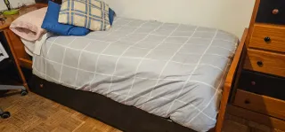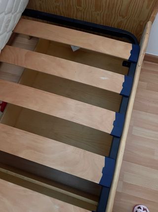 Cama individual de madera con un diseño clásico y elegante. Cuenta con espacio de almacenamiento adicional. - Estructura robusta de madera. - Cajones integrados bajo la cama. - es una cama de 90x200 -la cama no se ha usado nunca -colchon no incluido