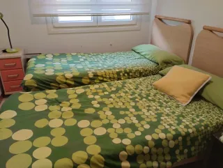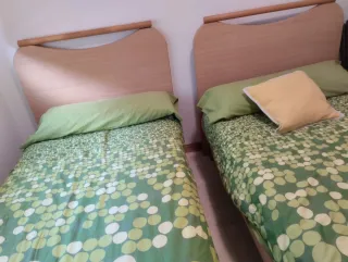 Conjunto de dos camas individuales con cabeceros de madera y ropa de cama en tonos verdes y amarillos. - Cabeceros de madera con diseño curvo. - Incluye dos juegos de ropa de cama con estampado de círculos. - Cojín decorativo amarillo incluido en una de las camas. 100 euros cada una.