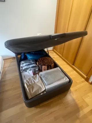 Somier para cama de matrimonio con un diseño elegante. - Estructura metálica. - Tapizado en tela. - Patas color negro y desmontables a rosca. ( Tiene dos pequeñas perforaciones en la tela, en la foto se ven más grandes de lo que son en realidad pero no afecta para nada la estructura del somier)