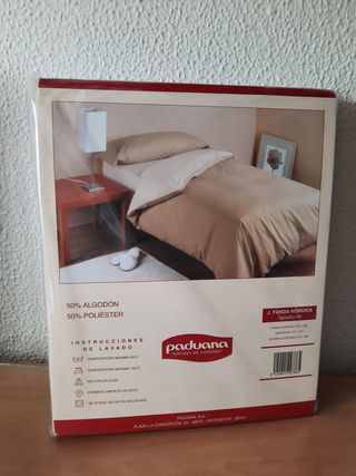 Se vende funda nórdica para cama de 90 cm. Es de color beige. 50% algodón y 50% poliéster. Contiene: Funda nórdica (150x240), almohada (43x110) y bajera ajustable (90x190). Se encuentra sin estrenar. SE HACEN ENVIOS.