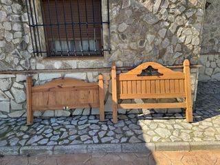 Conjunto de cabecero y respaldo para cama, fabricado en madera. - Diseño rústico. - Acabado en tono natural. Detalle decorativo en forja. Tienen la misma medida, solo que el respaldo mide 1,2 m de alto.
