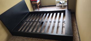 Estructura de cama de matrimonio de 135cm. Diseño por encargo. Madera lacada en color negro y está en muy buen estado. - Perfecta para colchón de 135x190 cm. - Diseño bajo, sencillo y elegante. - Listones de madera incluidos. - Medidas: largo 214cm ancho 150cm alto 23cm * Cabecero: alto 90cm/ ancho 150cm Se entrega desmontada. No se realiza envío (recogida en Ferrol) * Posibilidad de añadir un colchón viscoelástico usado por 50€ más.