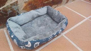 Cama suave y acogedora para mascotas pequeñas, ideal para gatos o perros. Su diseño con bordes elevados proporciona un espacio seguro y confortable. - Exterior con estampado de figuras. - Interior de pelo gris. - Nueva. Sin usar