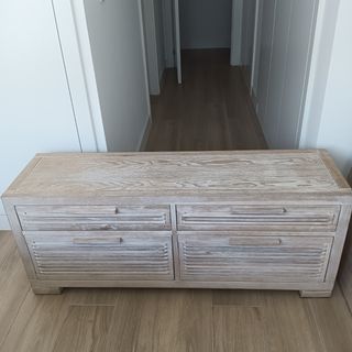 Mueble versátil que puede usarse como mueble de TV o como pie de cama. Su diseño de madera le da un toque elegante. - Cuatro cajones amplios. - Tiradores integrados en los cajones. - Acabado con vetas de madera.Posibilidad de tenir en otros tonos.