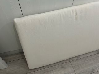 Cabecero artesanal de forma rectangular con el lado superior curvado. Hecho con una base de madera, tela acolchada para darle esponjosidad, y forrado con una tela beige clarita con patrón de espiga. Mide 160x60x8cm, con dos argollas ya puestas a 124cm (se pueden cambiar de sitio según interese). Pesa unos 11kg. Entrega en mano en Rivas-Vaciamadrid.