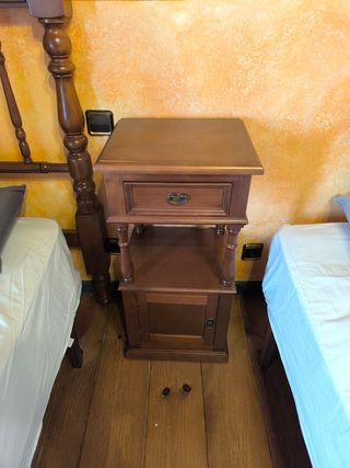 Mesitas de noche y cabeceros de cama con un diseño clásico y elegante. - Fabricada en madera. - Acabado en color marrón. - Cuenta con un cajón y un compartimento inferior con puerta. Se vende también cabeceros de las camas