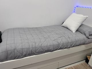 Cama compacta de Ikea, ideal para optimizar el espacio. Su diseño moderno y funcional la hace perfecta para cualquier habitación. - Incluye dos cajones amplios para almacenamiento. - Estructura robusta y acabado limpio.
