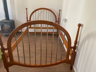 Estructura de cama de madera maciza de 135 cm. - Diseño clásico con cabecero y piecero curvos. - Barras metálicas en el cabecero y piecero. - Postes torneados en las esquinas.