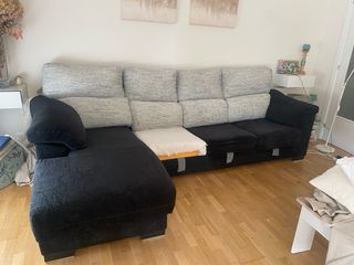 Sofá cama de 4 plazas con chaise longue, ideal para aprovechar el espacio. -Calidad muy buena - Tapicería de tela negra - Funda beige que recubre incluida en el precio - Respaldos articulables -Falta la funda de un cojín