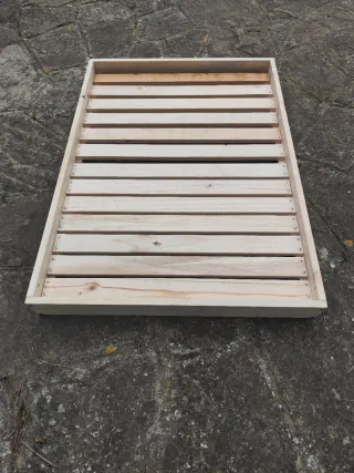 Cama para perro fabricada en madera, con un diseño rústico y natural. - Material: Madera. - Color: Beige y marrón. Confort y calidez para tu mejor amigo! 🐶❤️ Sommier de madera de pino natural ideal para perros muy grandes o seniors que necesitan descanso cómodo sin pasar frío. ▷ Montado y listo para usar ▷ Medidas exteriores: 102 × 74 cm ▷ Espacio útil interior: 97 × 70 cm Elevado del suelo para mantener el calor y evitar corrientes — perfecto para descanso diario o si tiene articulaciones delicadas. Cómodo, robusto y con estilo — ¡tu perro merece este rincón! 🛏️✨ Precio nuevo 97e