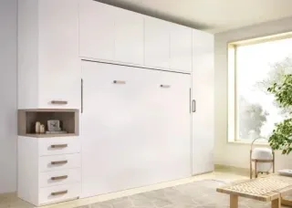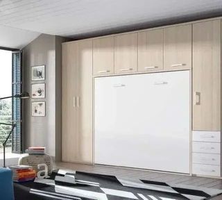 Completísima habitación con cama abatible de 120 x 190,altillo superior de 4 puertas,armario rincón con cajones y hueco simpatia y armario de 1 puerta.Opción para cama de 135 y 150 Medida total de la composición 290 de ancho y altura 220.Opción altura 240, diferentes opciones de color y tiradores Transporte y montaje opcional...175€(hasta 15 km).
