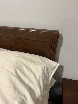 Se vende estructura de cama con cabecero y colchón. - Materiales: madera y tela. - Colores: marrón y blanco.