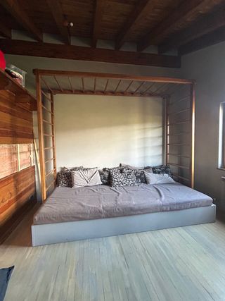 Este sofá cama estilo chillout es perfecto para relajarse. Su diseño combina madera y tela para un look moderno. UTIL COMO SOFA, ESPACIO DE JUEGOS y CAMA FAMILIAR. - Estructura de madera robusta. Hecho a medida. - Tapicería de tela cómoda.
