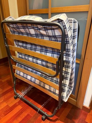 Cama plegable, ideal para invitados o espacios reducidos. Para estrenar. - Estructura negra de metal y madera. - Colchón con funda de tela a cuadros.