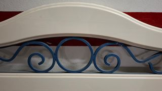 Conjunto de cabecero y base de cama. - Estructura de madera y metal. - Diseño con detalles ornamentales en el cabecero.